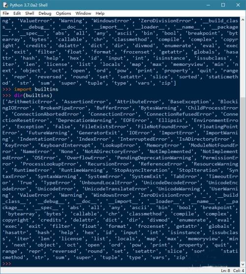 Python 解释器内置了一些常量和函数,叫做内置常量(Built-in Constants)和内置函数(Built-in Functions),我们怎么在 Python IDLE 里得到全部内置常量和函数的名字呢?