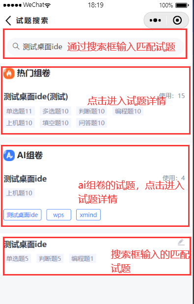3.【试题搜索页】点击首页的搜索框,进入试题搜索页面,在该页面有热门组卷,也有ai组卷,也可以通过输入框输入关键字匹配试卷,点击对应试题即可查看试题详情,如下图: