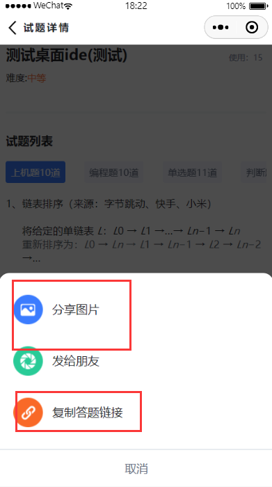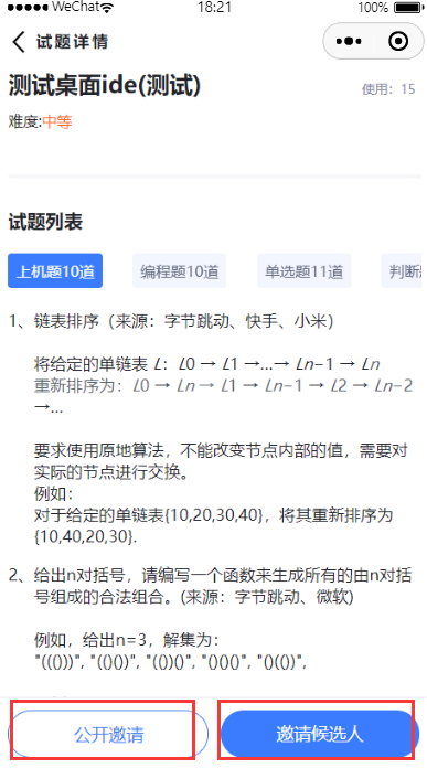 (1)点击公开邀请,点击分享图片生成带二维码的图片,求职者通过识别二维码答题;也可以通过复制答题链接,求职者通过链接答题,如下图: