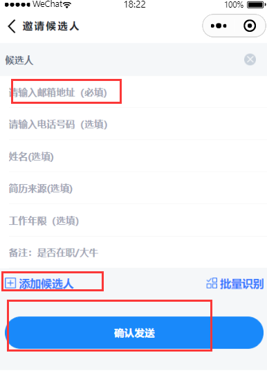 5.【邀请候选人页】输入求职者相关信息,发送该试题,点击添加候选人同时添加多个求职者,点击确认发送进入邀请记录页,如下图: