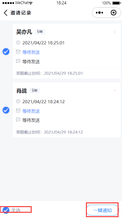 6.【邀请记录】批量添加过来的候选人在该页面可以一键通知,同时发送该试题给多个求职者,如下图:
