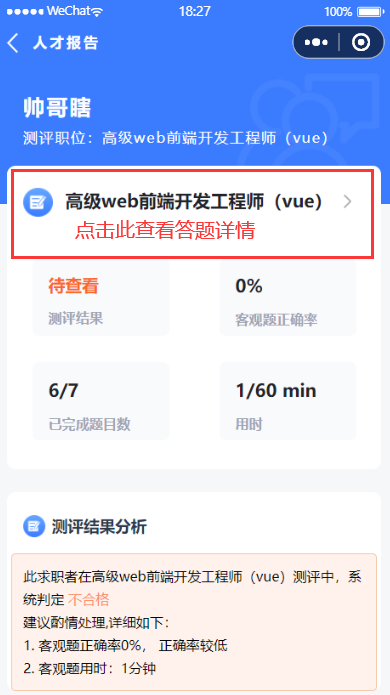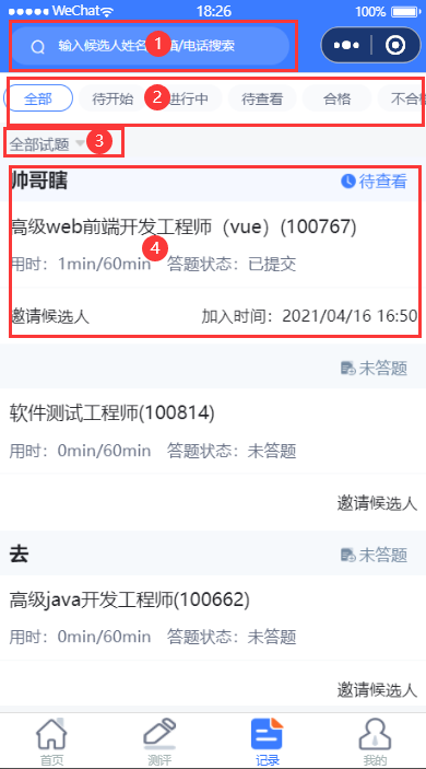 (1)点击1区域可搜索对应的候选人的答题记录及状态