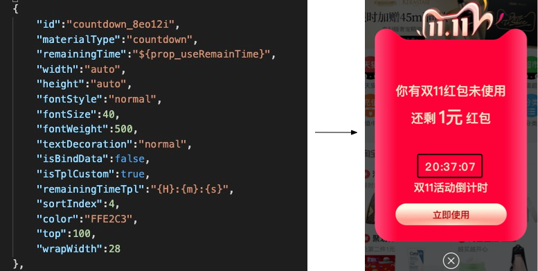 Pop形态下的UI组件,基于围绕着如下几个类型展开:图片、文本、视频、容器、倒计时、点击热区等。即通过提供大图或视频为背景,并通过容器+内部组件形成内部复杂的界面布局。我们针对各个组件提供了统一的布局配置+各自不同的素材配置。以一个倒计时组件为例: