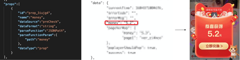 Pop的内容与服务端数据做绑定时,需要提供一套提取数据的描述方案。而数据来源因Pop的整体链路设计,存在多个可能来源。我们通过 指定数据来源+提供插入式Mtop接口配置+接口数据提取Function 完成数据提取的设置,形成一个变量。仍以上述Demo为例,其中红包金额的变量为服务端Mtop接口返回数据。其提取流程示例: