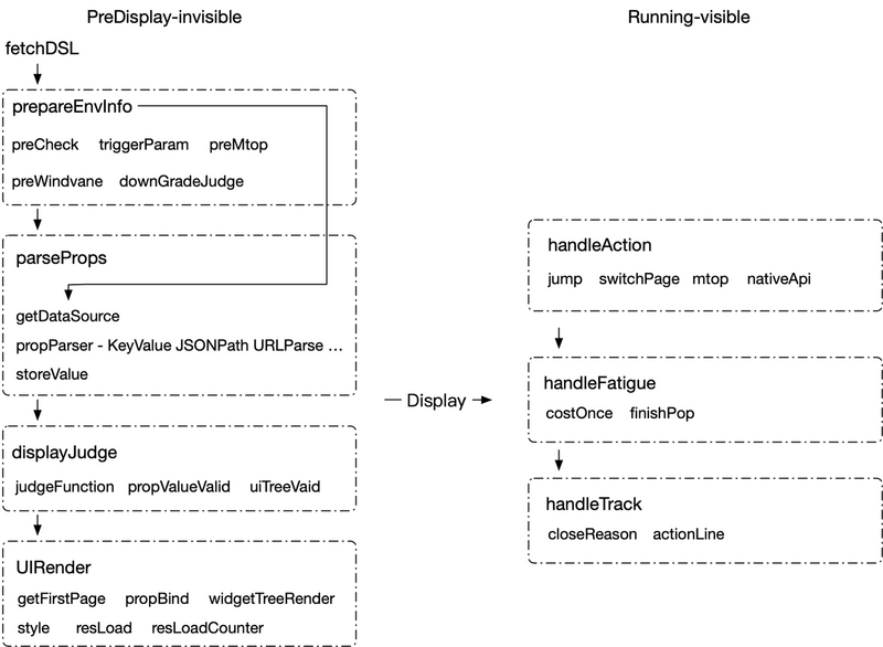 解析引擎的主体工作流程,分为PreDisplay阶段:获取DSL、获取各环境数据、解析变量、完成UI渲染并曝光,以及Running阶段:在曝光后的事件交互处理。