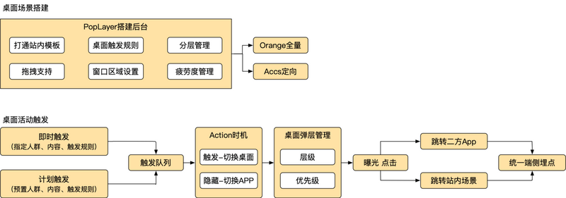 APP站内的触发流程,即PopLayer端侧中间件,功能上有非常丰富的积累,可支撑几乎所有Pop业务的各方面诉求,此处不进行展开,本文将从弹出Pop后的解析引擎、Android桌面的触达领域支持方面进行介绍。