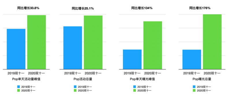 除文章开头提到双十一期间的业务覆盖率已经达到75%之外,得益于搭建模式对研发效率的提升,今年双十一期间,手淘内Pop的业务量和整体流量也有了大幅度飞跃: