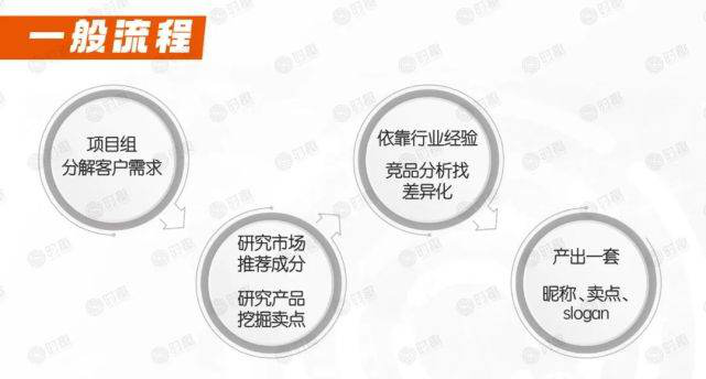 但在传统的代理商服务中,一般是代理公司接到客户需求,然后根据研究市场推荐成分+研究产品,去挖掘产品的卖点;紧接着依靠行业经验+竞品分析,寻找产品传播差异化;最终产出一套产品昵称、卖点、Slogan等创意。