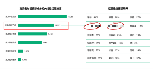 但通过对提及这个成分的全网社交话题分析后发现:市面已经有两个知名品牌与该成分的捆绑度很高,同时发现消费者对该成分的不耐受、见光分解等劣势讨论也比较多,这指出了这个成分的市场竞争劣势。