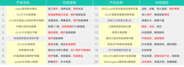 且从大盘上看,产品功效中的“保湿补水”仍是面霜第一诉求,美白、修护、抗老诉求依次递减。