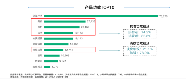同时,一个重要的发现是:抗老功效细分中,“抗初老”占比低于“抗衰老”,仅占14.2%;而淡纹功效中,“淡化细纹”占比也小于“抗皱”,只占21.1%。