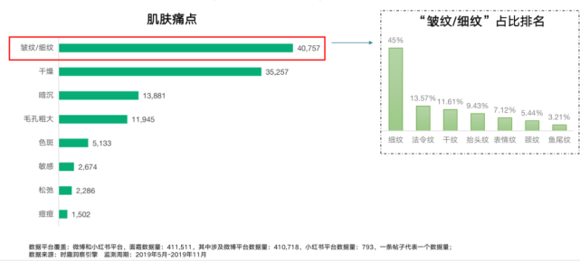 而在消费者肌肤痛点的数据分析中又发现:皱纹/细纹是第一肌肤痛点,干燥紧随其后,远超其他痛点,而细纹对应的正好的“抗初老”与“淡化细纹”。