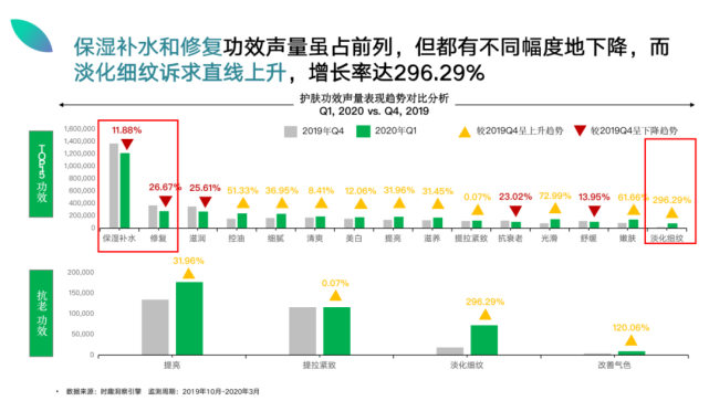 紧接着,热门功效及护肤痛点传播力分析中又发现:保湿补水和修复功效声量虽占前列,但都有不同幅度地下降,而淡化细纹诉求直线上升,增长率达296.29%。